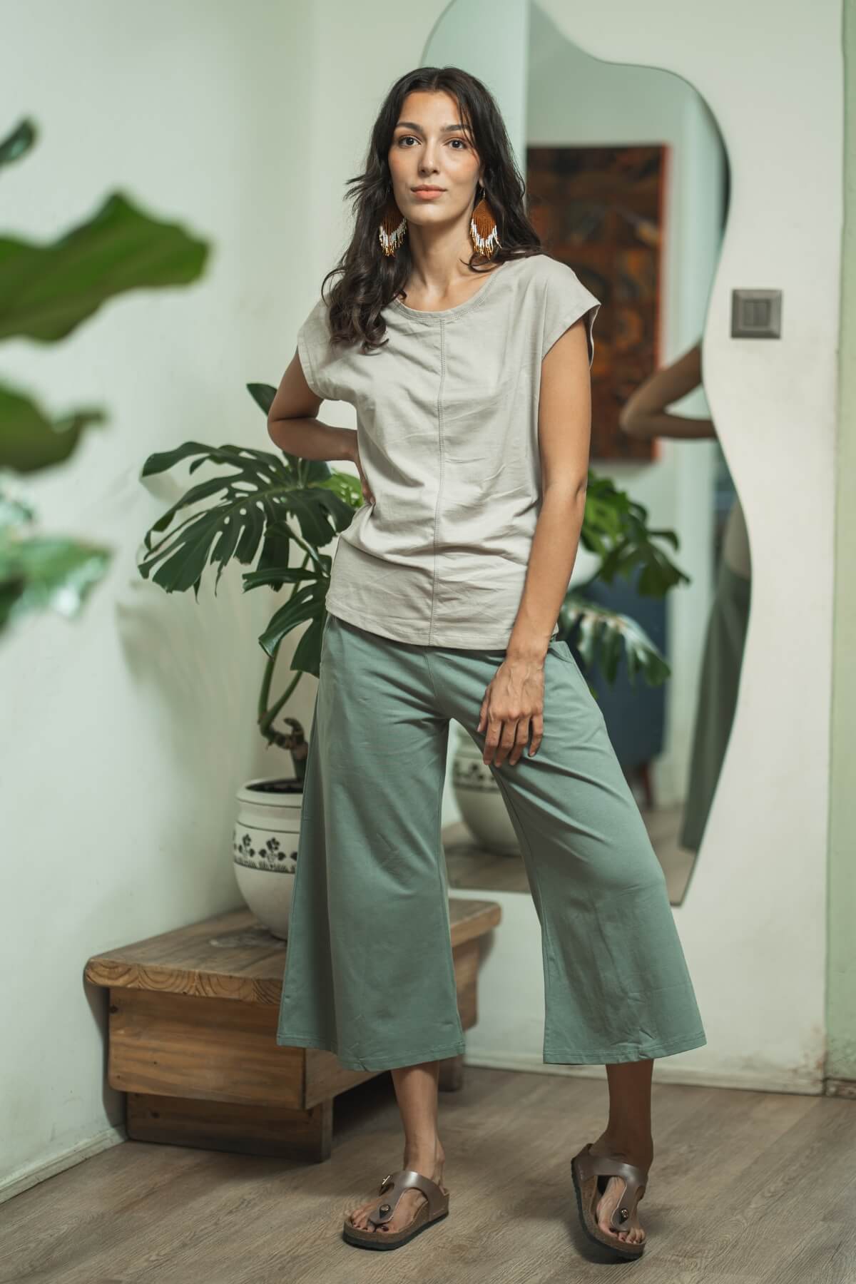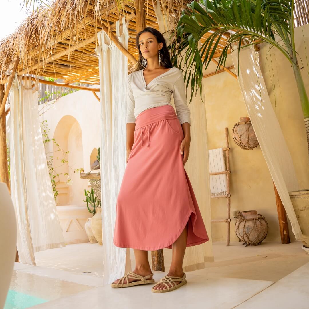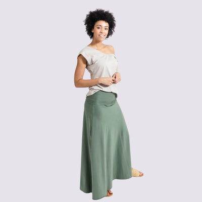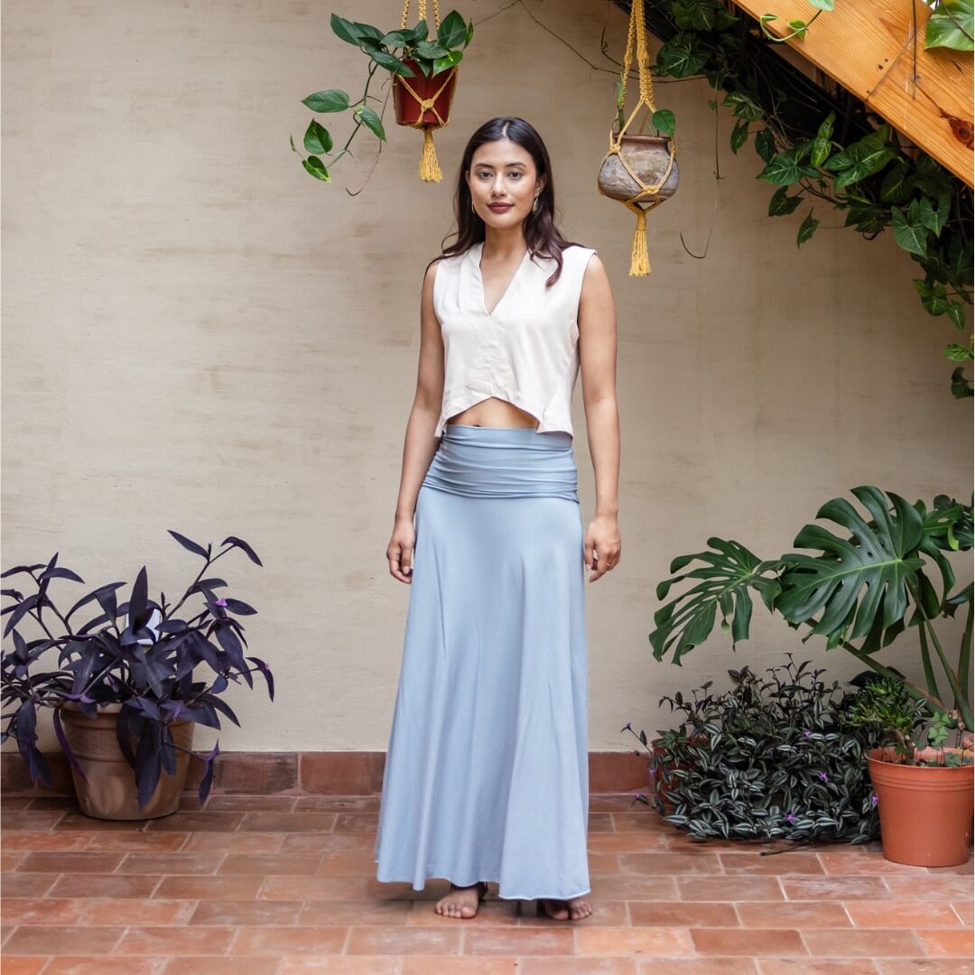 "The one thing all our turn down waistband pants and skirts have in common is the beautiful organic cotton fabric. This fabric lends itself beautifully to a textured aesthetic and layered look; it's light enough to wear comfortably all year around, yet heavy enough to sit perfectly flat when turned over at the waist." - Mel