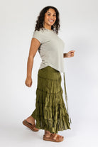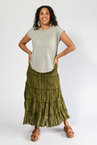 Our Franti skirt is a dream to wear ... while the cotton fabric is quite thin (making it cool to wear), there's loads of it so it swirls and twirls with you as you move. Give it a spin! The waistband features a comfortable, flexible shirring with a false tie-up. Wear it on either the hips or the waist to adjust the length and find your perfect fit.