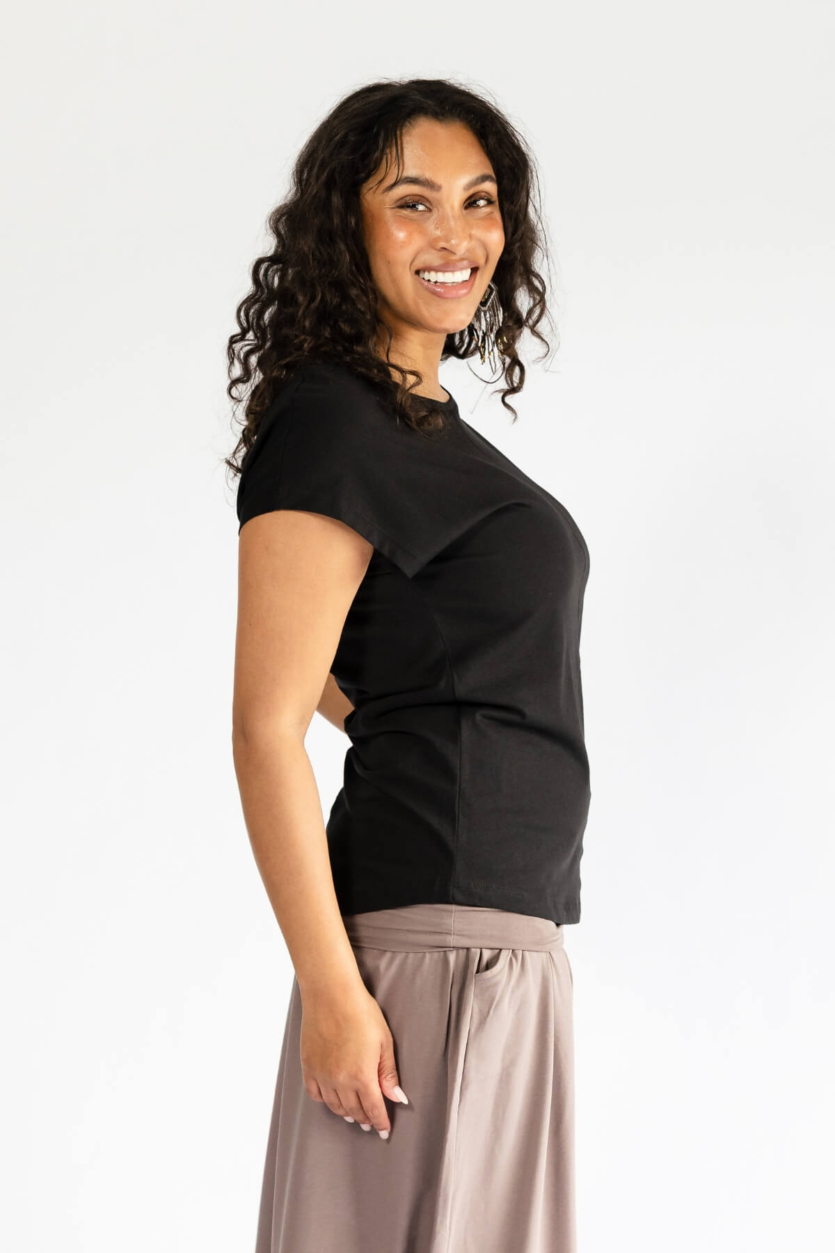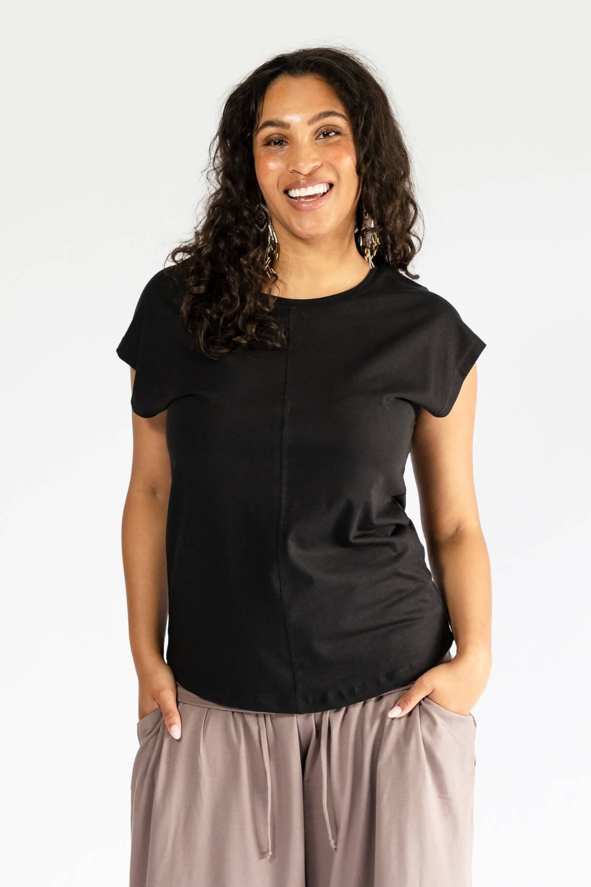 Our organic cotton everyday Lovina T-shirt is a staple piece that will pair with pretty much all your Surya bottoms. The relaxed fit of this top means it doesn't cling to you, and the wide capped sleeve with gentle bat-wing shape is super flattering on most body shapes.